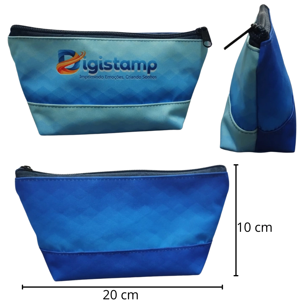 Esqueça os brindes genéricos. Com a personalização total por sublimação, a área externa da necessaire se transforma em uma tela em branco para sua identidade visual, com cores vibrantes e fidelidade total ao seu design.